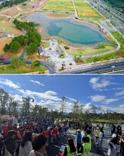 龍州濕地是九龍江流域山水林田湖草沙一體化保護(hù)和修復(fù)項(xiàng)目海綿城市建設(shè)范例工程,也是我市2023年十大重點(diǎn)攻堅(jiān)項(xiàng)目北部新城建設(shè)的“點(diǎn)睛之筆”,主要使用的是國(guó)家政策補(bǔ)助資金。項(xiàng)目占地面積約20公頃,通過(guò)“護(hù)山、理水、營(yíng)林、興田、清湖、豐草”六大舉措,構(gòu)建了蓄洪湖區(qū)、生態(tài)修復(fù)區(qū)、農(nóng)田區(qū)及休閑區(qū)多樣用地,同時(shí)設(shè)置了蓄洪湖、濕地步道、山谷攔蓄、引水工程等海綿設(shè)施,實(shí)現(xiàn)“城在田中田在城中”山水田園與城市和諧共生的美好景象。