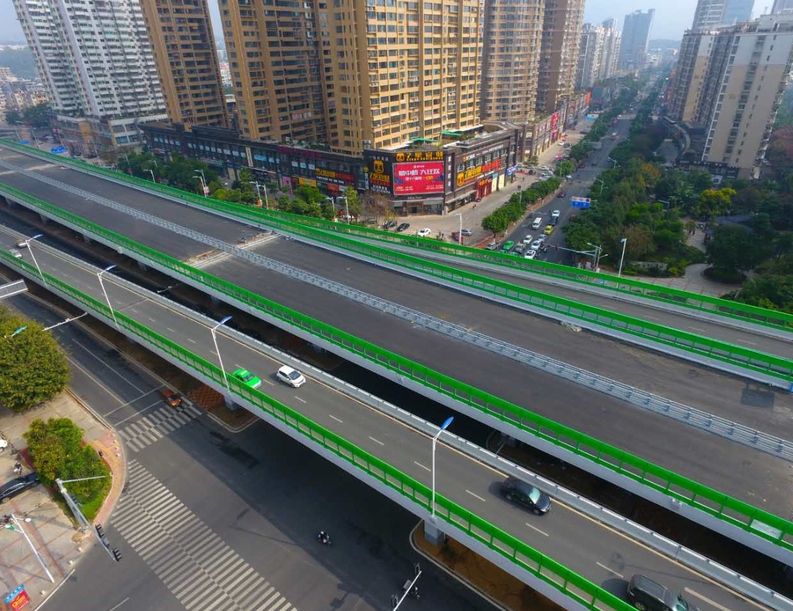 龍巖大道高架橋項目為省、市重點建設項目,是龍巖中心城市連接南北、溝通新老城區的重要樞紐,項目位于龍巖市南北交通中心軸和景觀軸線龍巖大道上,全長3395m,包含橋梁和地面道路兩大部分,其中橋梁工程總長2329m,橋寬26m,包含一座190+150m獨塔斜拉索鋼箱梁主橋(主橋寬36.3m),全線設計為雙向六車道,設計車速60km/h,在西陂路及人民路處各設置上下匝道,跨越雙洋路、羅龍東路、人民路、登高西路、西陂路城市主干道,項目總投資約24億元。
