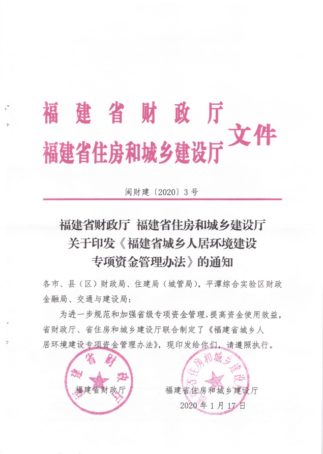 福建省財政廳福建省住房和城鄉建設廳關于印發《福建省城鄉人居環境建設專項資金管理辦法的通知》(閩財建[2020]3號)