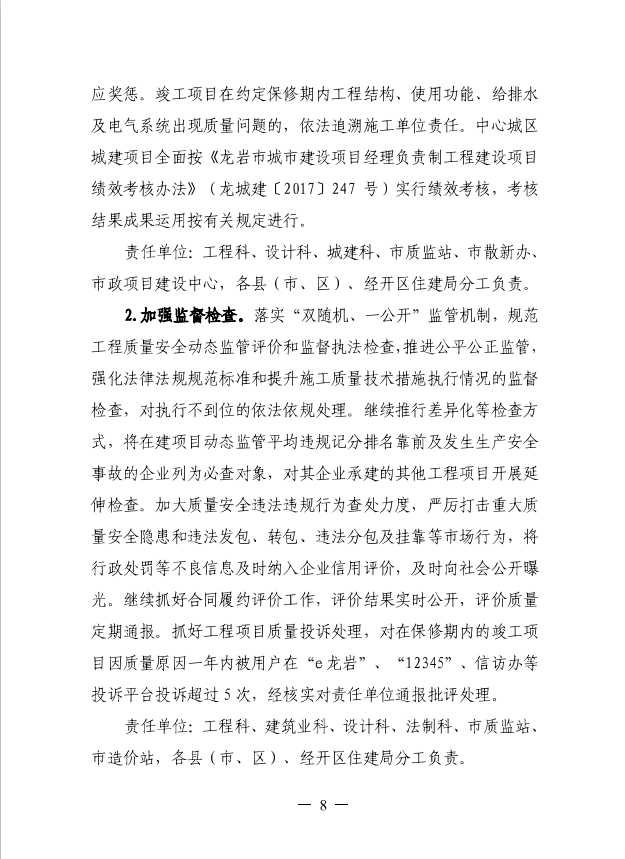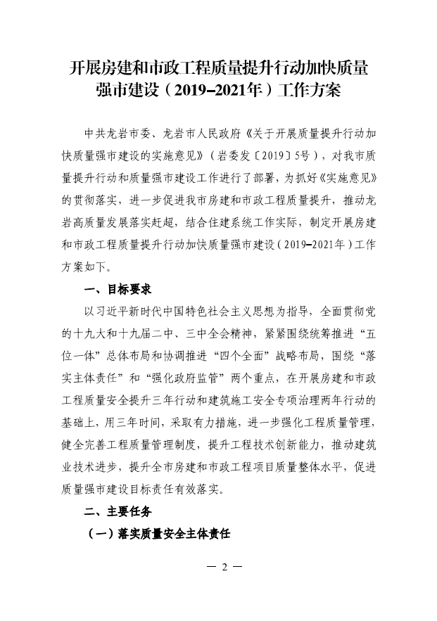 龍巖市住房和城鄉建設局關于印發開展房建和市政工程質量提升行動加快質量強市建設(2019-2021年)工作方案的通知