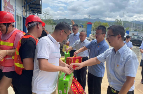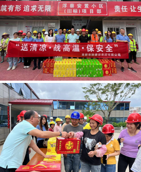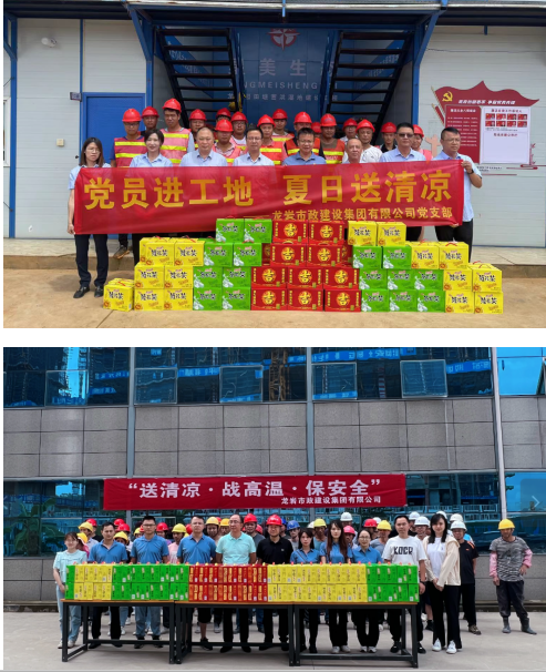 82122市政集團黨支部書記董事長總經理孔華同志公司領導班子成員及黨員志愿者小分隊分別前往園田塘蓄洪濕地工程浮蔡安置小區和龍欣安置小區等項目開展送清涼·戰高溫·保安全慰問活動高溫天氣下仍奮戰在一線的勞動者們送去300件的防暑降溫物資